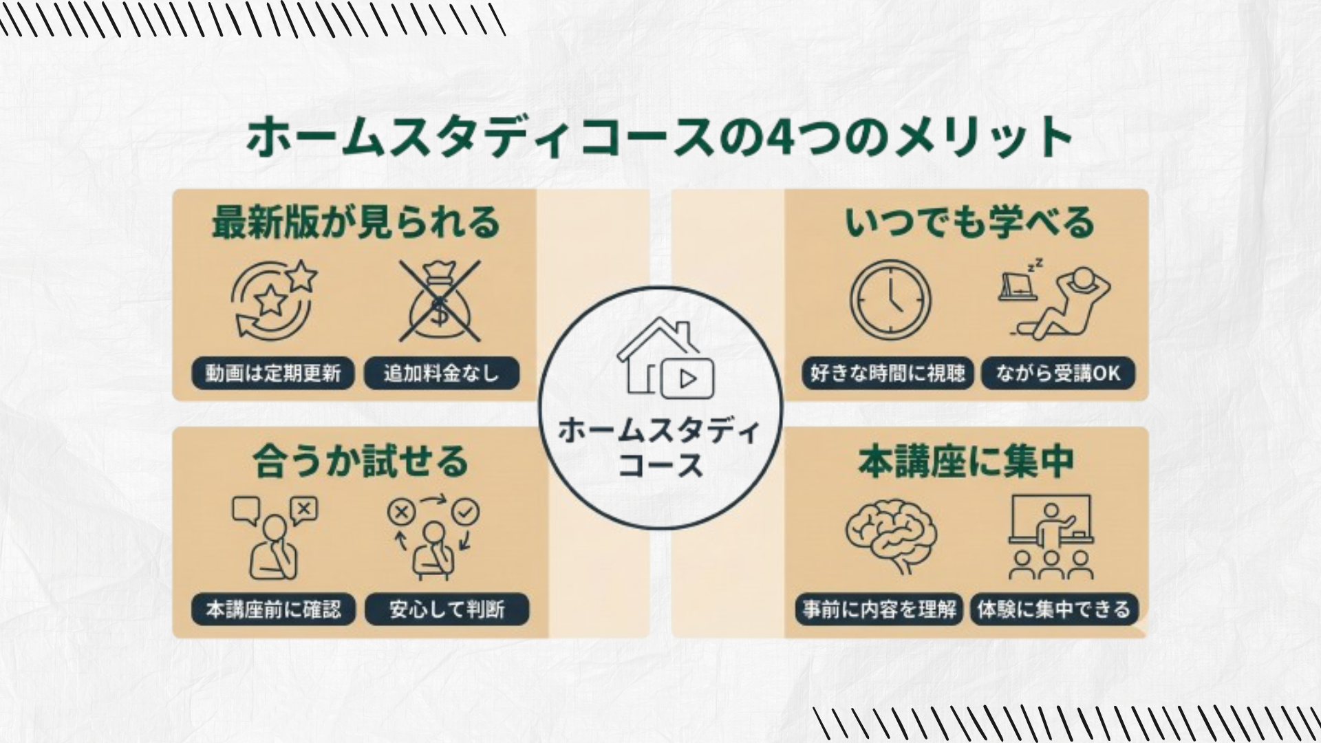 - 同じ内容を動画視聴で学べる「ホームスタディコース」
