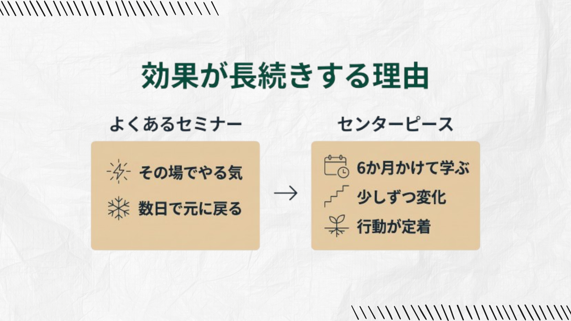 センターピースでは6カ月間の継続的なワークを通じて、じっくりと体に染み込ませ、習慣化を目指します。