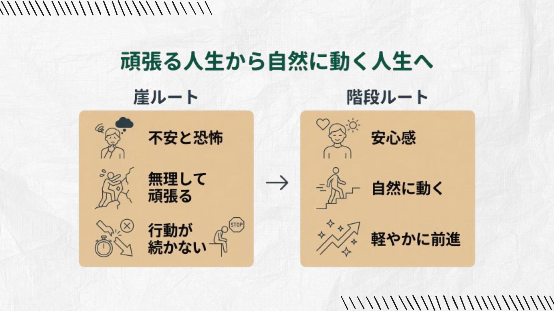 人生を山登りにたとえると、無理やり行動する「崖ルート」と、喜びから行動する「階段ルート」の2つのパターンがあります。