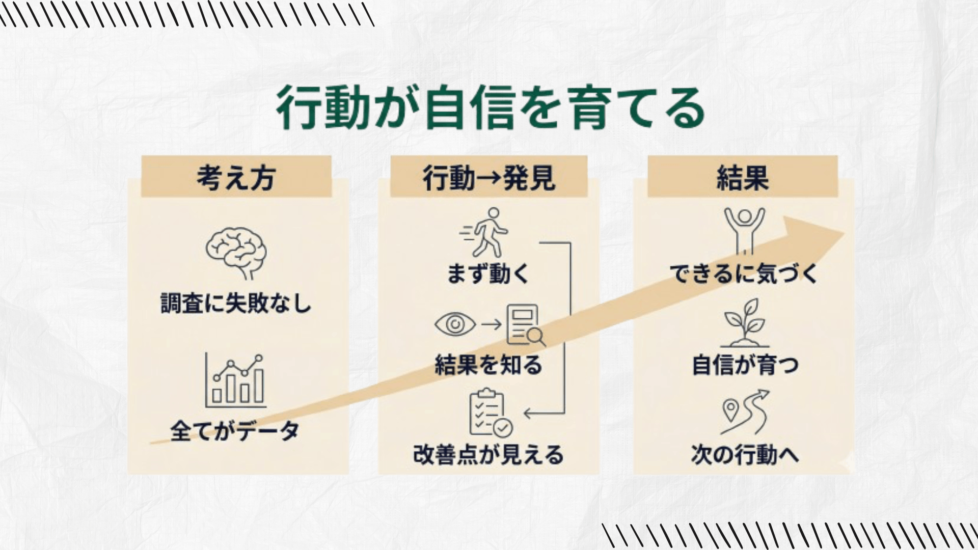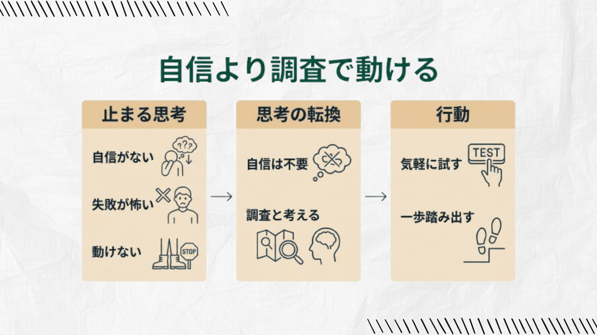 「自信がつくまで待つ」のではなく、まずは今のあなたを「調査」することから始めてみませんか?