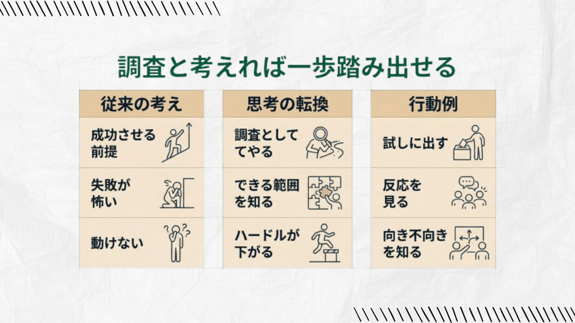 それは、自信をつけるためにやるのではなく、「調査のためにやってみる」という考え方です。