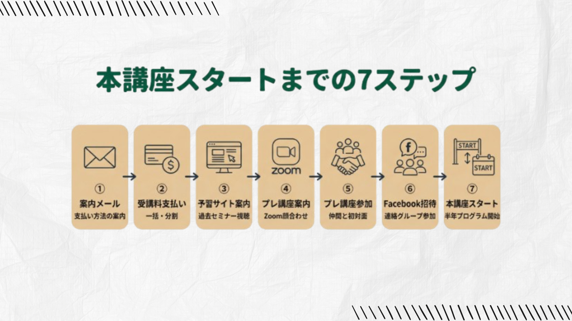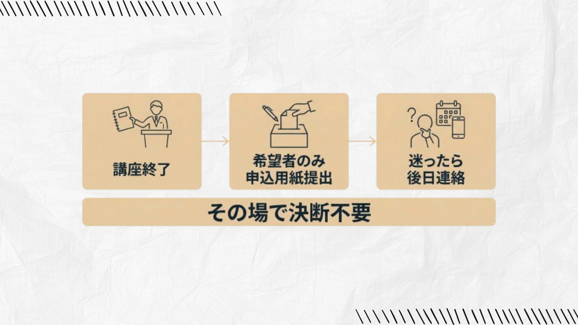 1日集中講座の最後に「本講座を受けます!」と決めた後の流れは、こちらです。