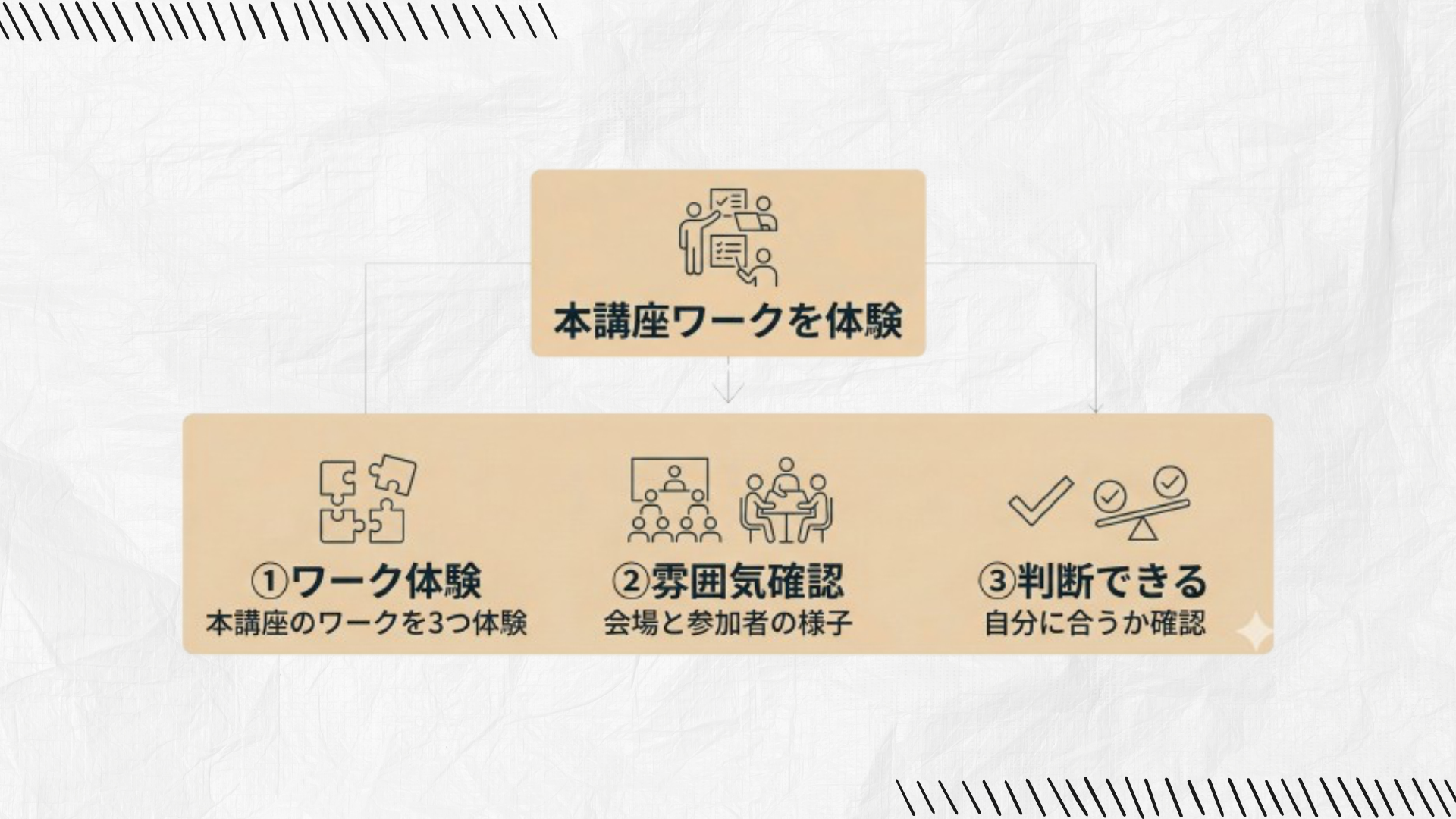 「気になっているけど、まずは雰囲気を知りたい」という方にとって、1日集中講座は良い判断材料になるはずです。