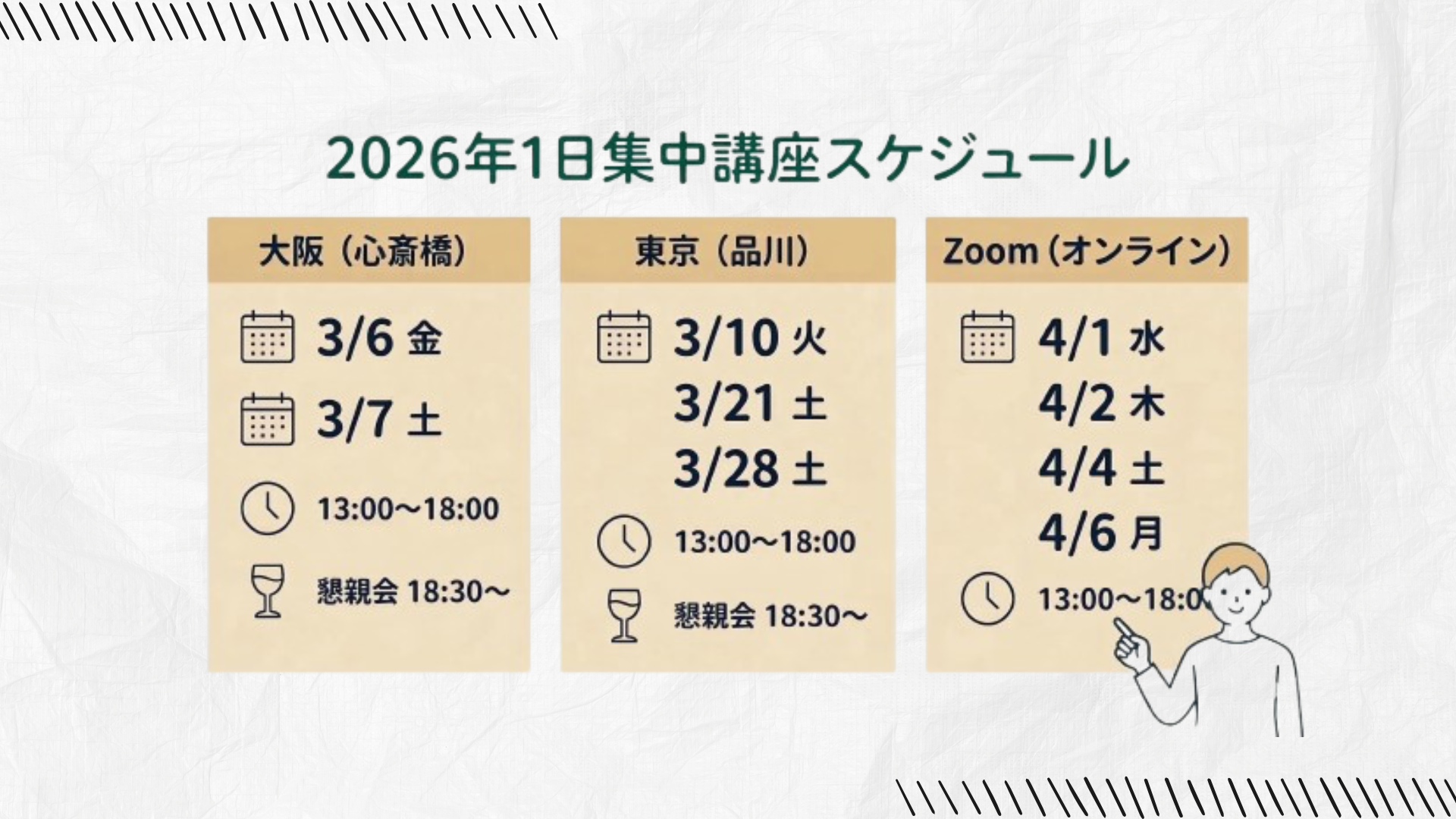 2026年に開催される1日集中講座のスケジュールが、こちらです。