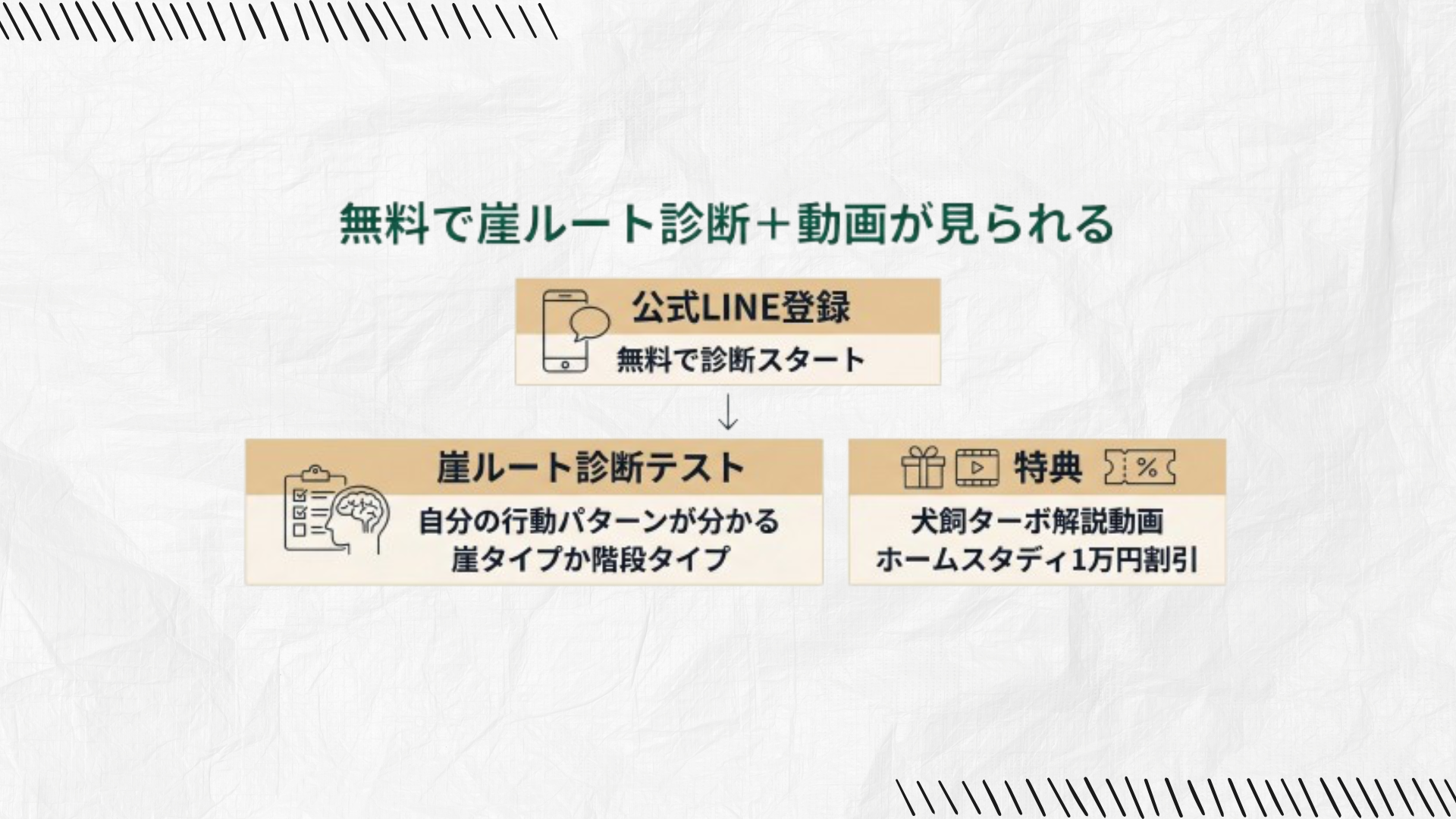 メルマガは無料で、「崖ルートと階段ルート」の説明を全9回で学びます。