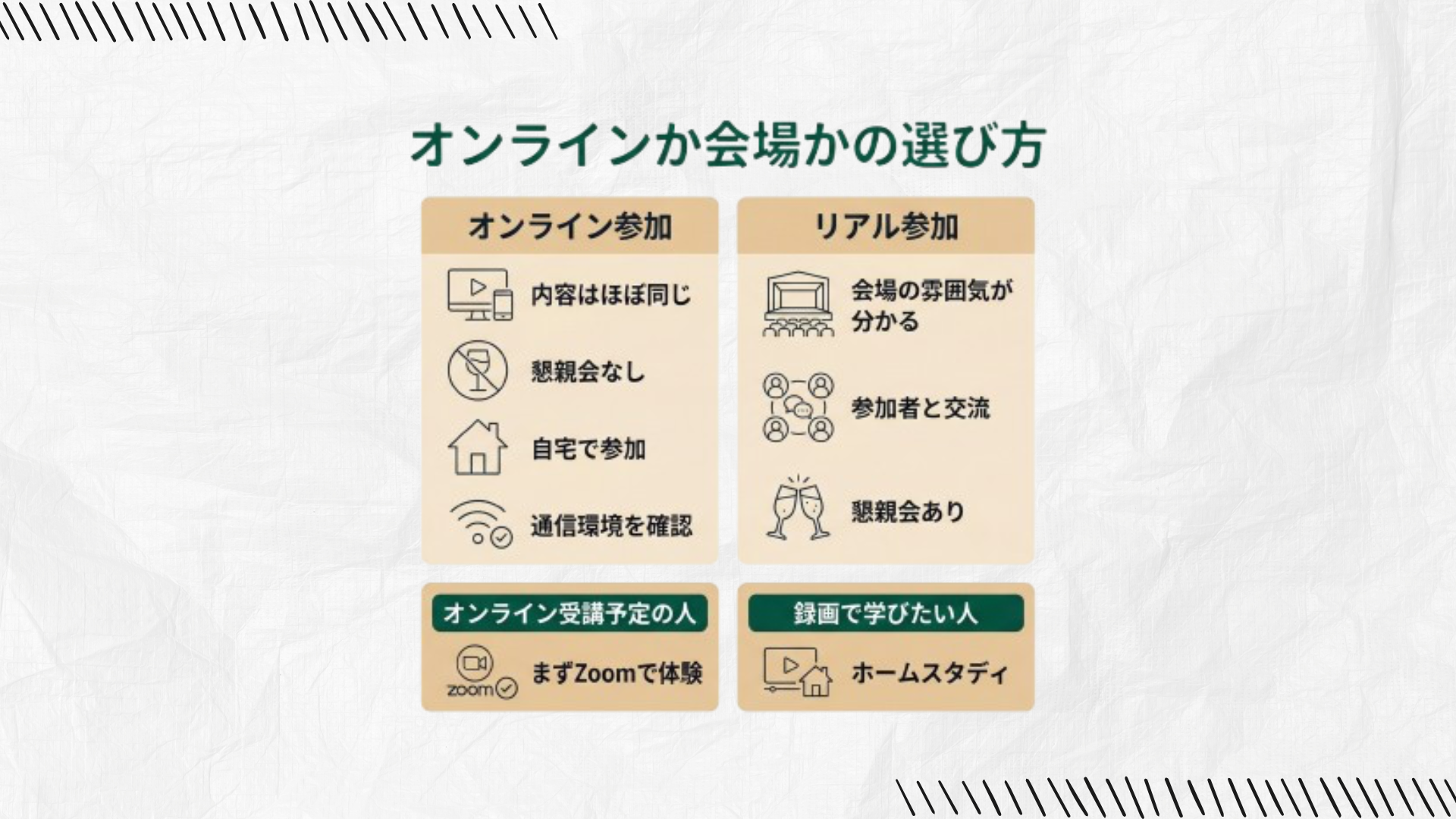 本講座もオンラインでの参加を考えている方は、録画を何度でも見てじっくり学習できる「ホームスタディコース」の方が、実は値段もお得で復習もしやすいのでおすすめです。