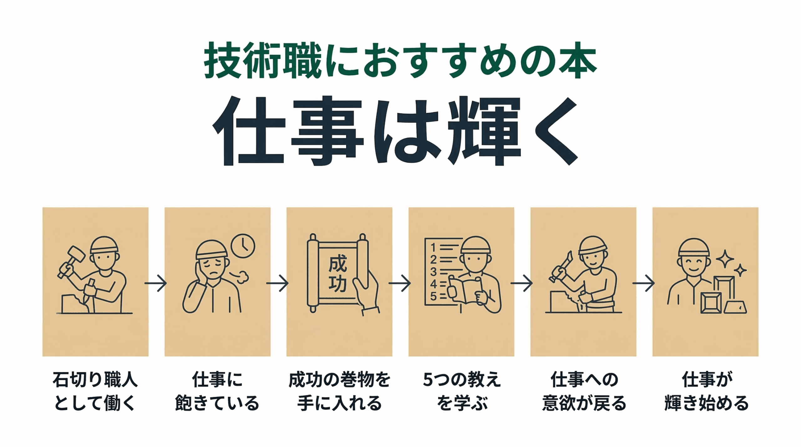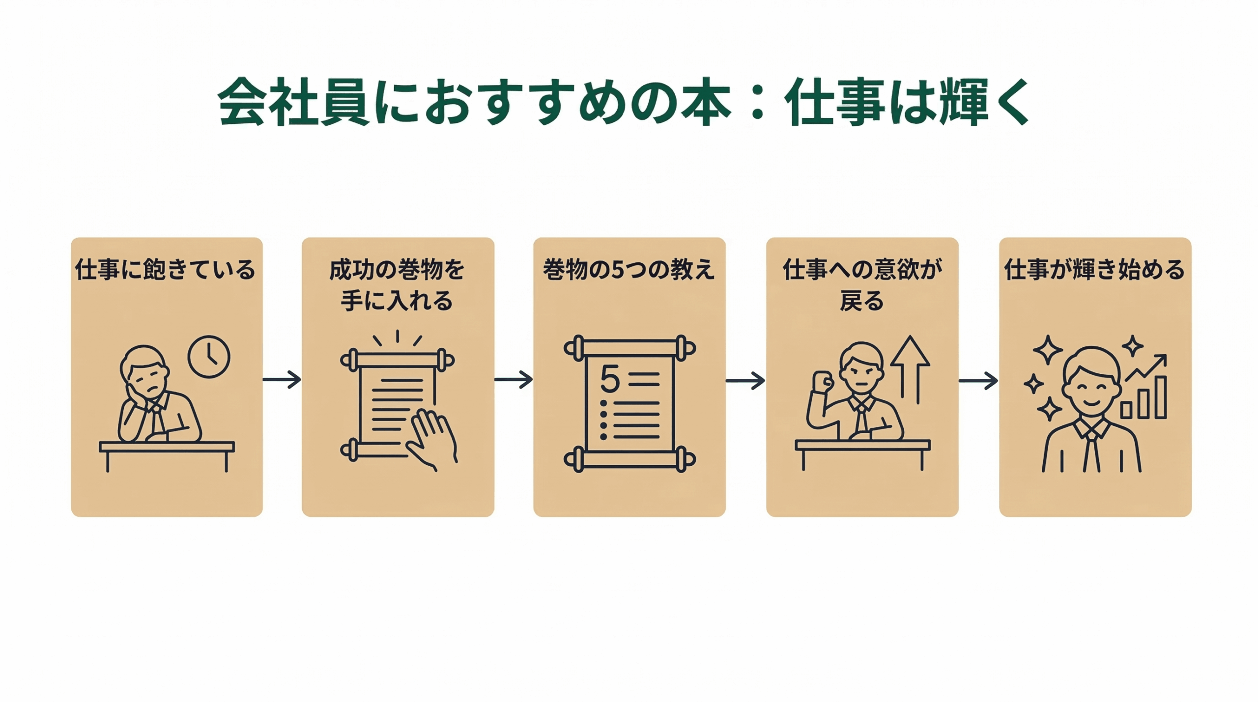 自分の仕事に飽きていた主人公が、巻物に書き記された教えによって、じょじょに仕事に意欲が湧き、自分を責めることがなくなっていく物語です。
