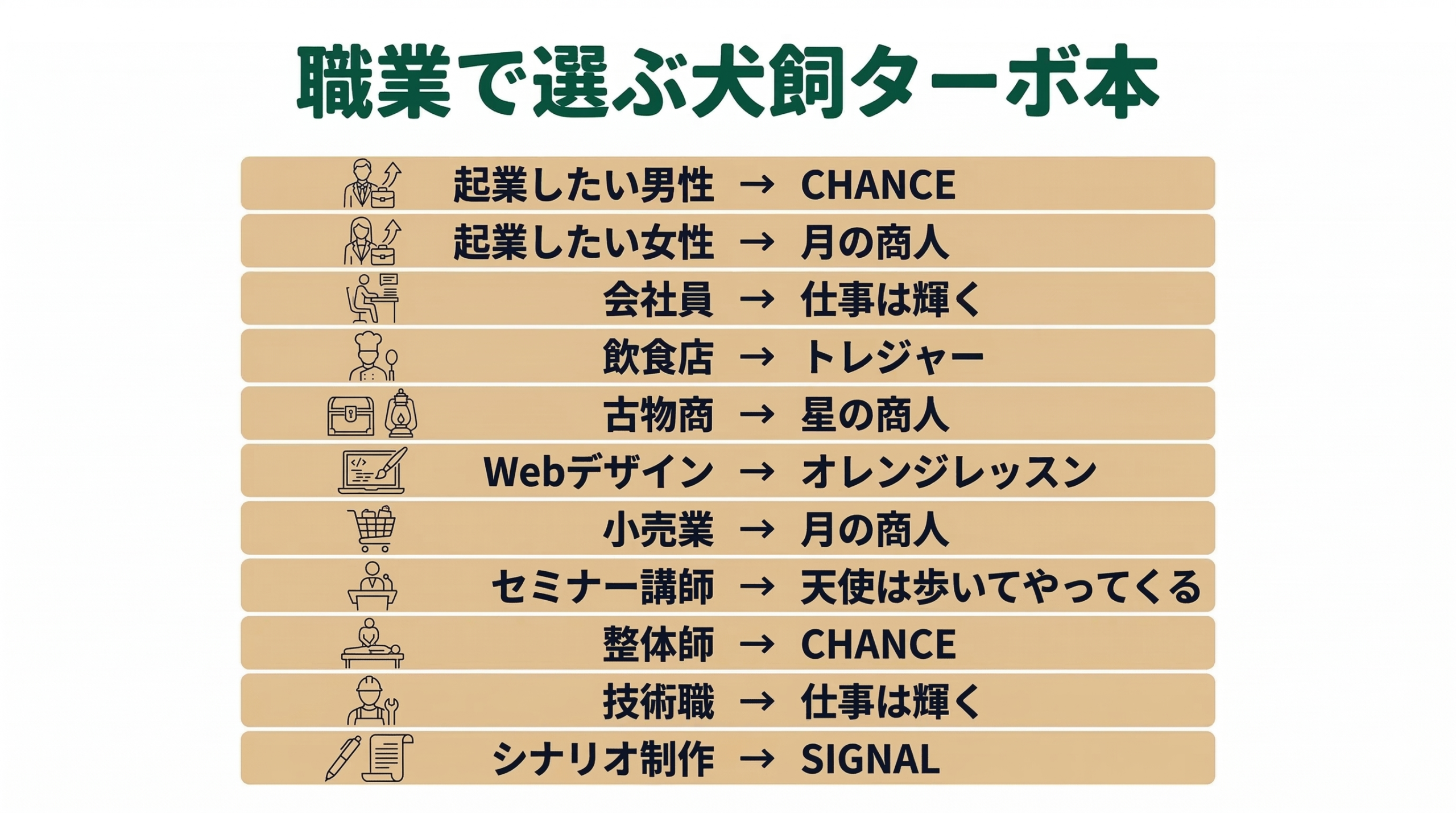 そこでこの記事では、犬飼ターボさんの本の「主人公の職業で選べるように11パターンに分類」してお伝えします。
