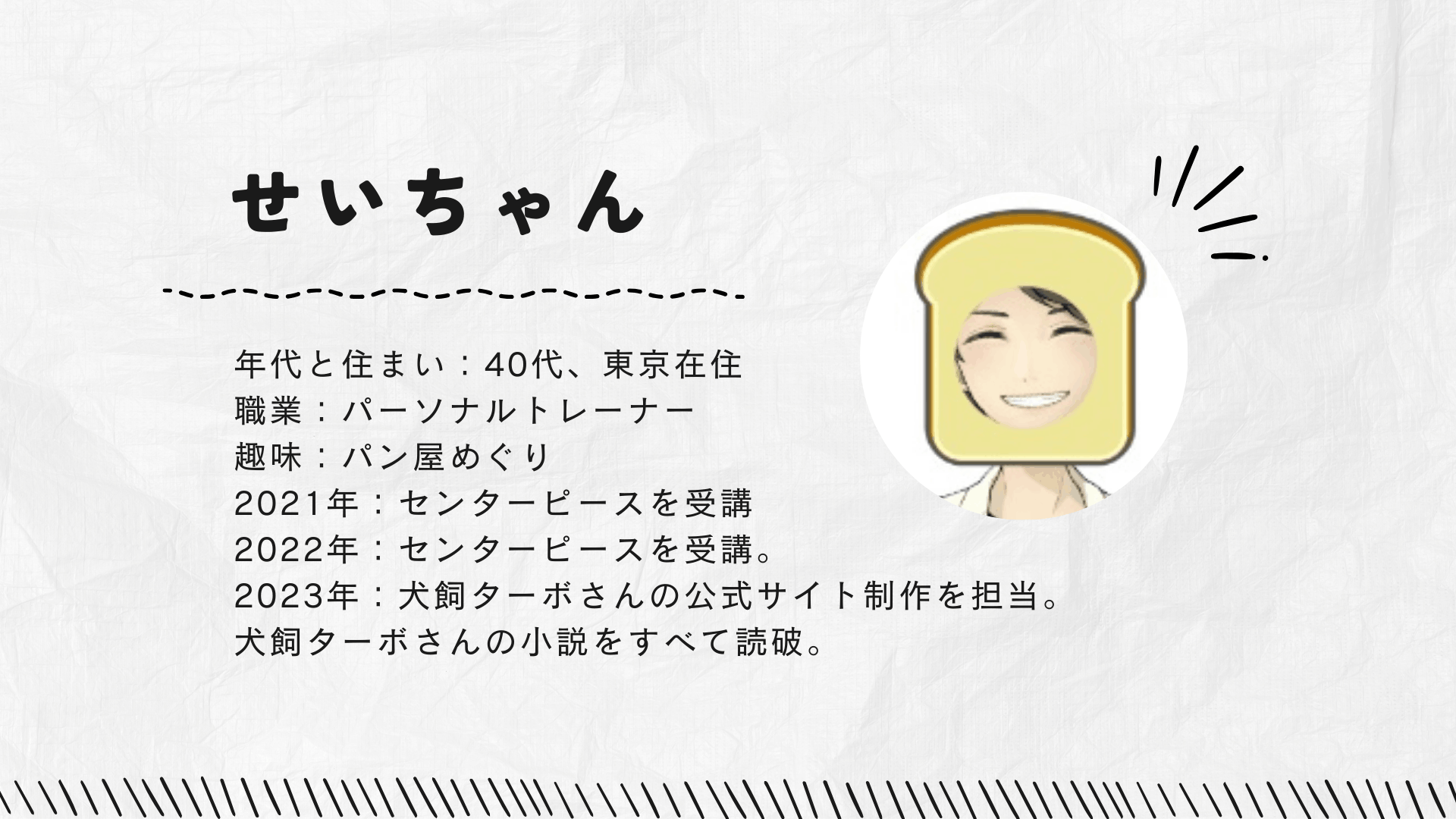 2021年からセンターピースを受講し、その後はセンターピーストレーナーや、犬飼ターボさんの公式ページ「1日集中講座」作成の担当として関わっています。
