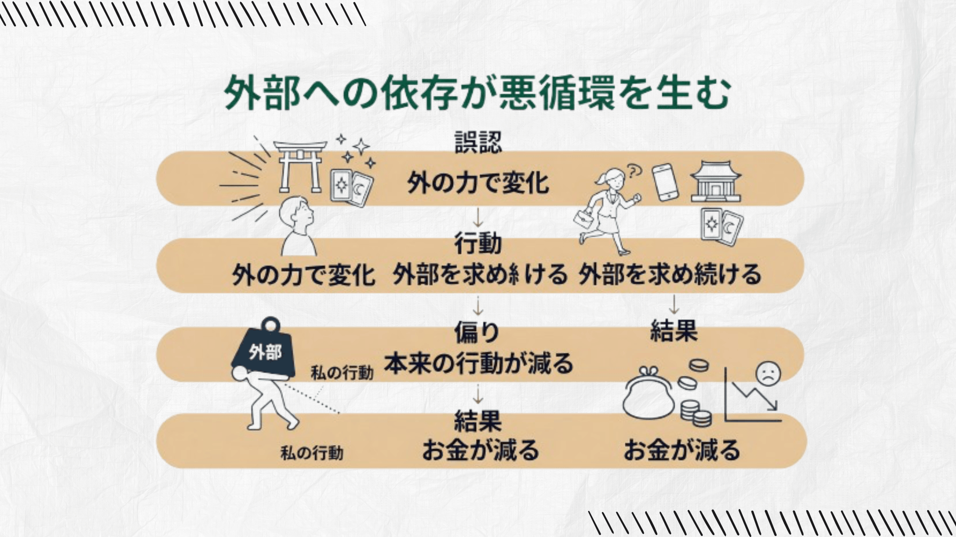 「お金の回りが良くなった」という言い方をしてしまうと、その原因を「自分の行動」ではなく「外部の力(場所・物・人)」に求めてしまいます。