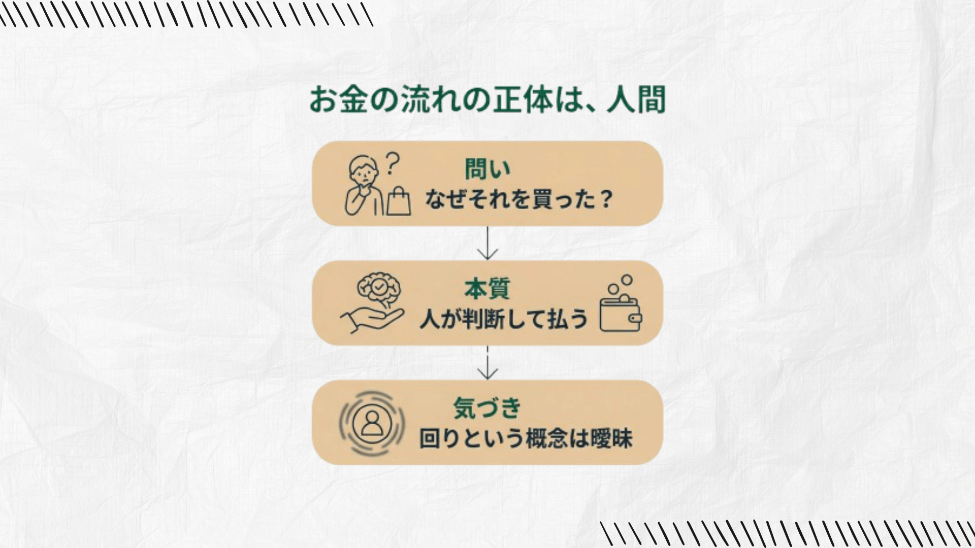 自分のお金を払う判断基準、そして周りの人の判断基準が見えてくると、「お金の回り」という漠然とした表現に頼ることが、いかに実態からずれているかが分かってきます。